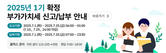 2025년 제1기(1.1~6.30. 기간) 확정 부가가치세를 7월 25일(금)까지 신고・납부하여야 합니다.